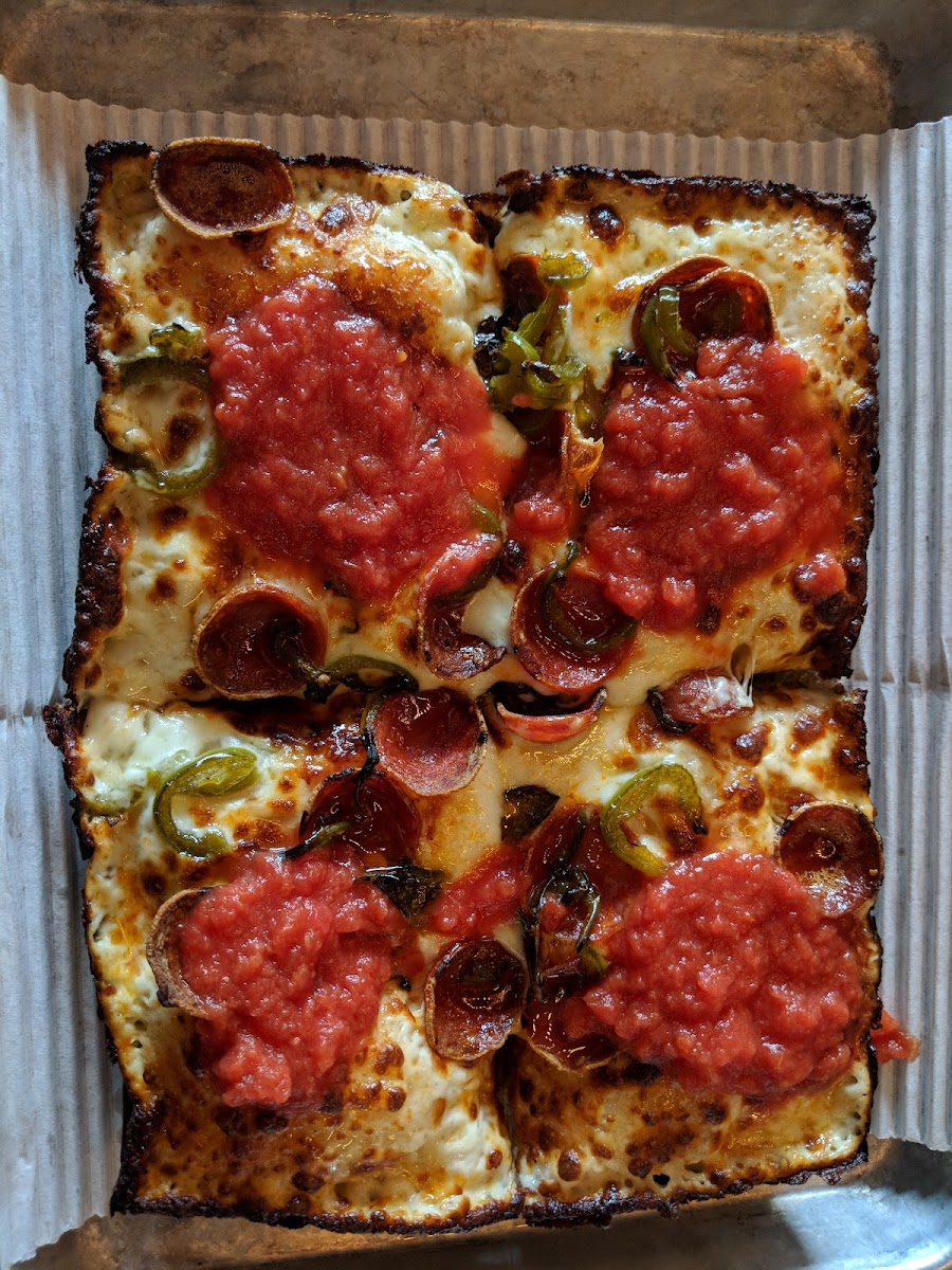 We had: crab fries (as you know, I'm a fan of crab fries-- but these were knock-your-socks-off spectacular), three chicken tenders on salad (tender, crispy, perfectly dressed), and a Detroit-style pizza alla vodka, which was probably the best pizza I've had in the city so far. Easy, seamless online ordering process too! Highly recommend!